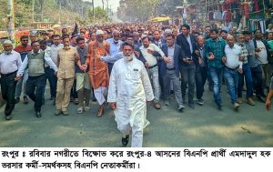 রংপুরের ৩টি সংসদীয় আসনে ভোট পুনঃগণনার দাবীতে বিক্ষোভ মিছিল, ডিসি অফিস ঘেরাও কর্মসূচী পালন করেছে বিএনপি নেতাকর্মীরা। রবিবার (১৫ ফেব্রুয়ারী) সকালে রংপুর-৩ আসনের বিএনপি প্রার্থী সামসুজ্জামান সামু, রংপুর-৪ আসনের প্রার্থী এমদাদুল হক ভরসা ও রংপুর-৬ আসনের প্রার্থী সাইফুল ইসলামের নেতৃত্বে নগরীতে পৃথক পৃথক বিক্ষোভ মিছিল গুরুত্বপূর্ণ সড়ক প্রদক্ষিণ করে। এরপর বিএনপি নেতাকর্মীরা জেলা প্রশাসক কার্যালয় ঘেরাও করে বিক্ষোভ করে। এ সময় তারা অভিযোগ করেন, ত্রয়োদশ জাতীয় সংসদ নির্বাচনে রিটার্নিং কর্মকর্তা ইলেকশন ইঞ্জিনিয়ারিংয়ের মাধ্যমে জামায়াতের প্রার্থীদের বিজয়ী করেছে। ভোট পুনঃগণনার আবেদন জানানো হলে তিনি টালবাহান করে সময়ক্ষেপন করছেন। দ্রুত সময়ের মধ্যে ফল পুনঃগণননা না হলে বৃহত্তর আন্দোলন গড়ে তোলার হুশিয়ারী দেন বিএনপি নেতাকর্মীরা। এরপর তিন প্রার্থী জেলা প্রশাসক ও রিটার্নিং কর্মকর্তা মোহাম্মদ এনামুল আহসানের সাথে সাক্ষাত করে ভোট পুনঃগণনার দাবী জানান।