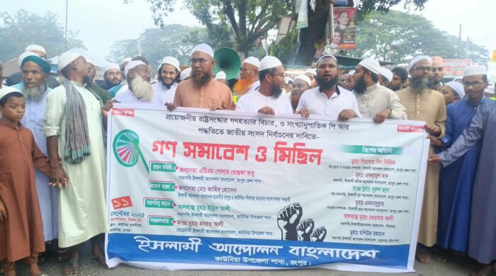 প্রয়োজনীয় রাষ্ট্র সংস্কার গণহত্যার বিচার ও সংখ্যানুপাতিক পি আর পদ্ধতিতে জাতীয় সংসদ নির্বাচনের দাবীতে বৃহস্পতিবার বিকালে ইসলামী আন্দোলন বাংলাদেশ কাউনিয়া শাখার উদ্যোগে গণসমাবেশ ও মিছিল করা হয়েছে। কাউনিয়া গালর্স স্কুল